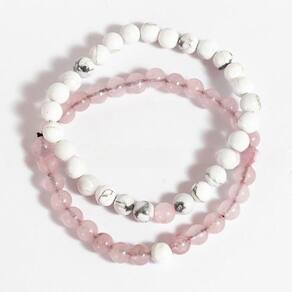 Pulseira Pedra Howlita e Quartzo Rosa Para Casal Bolinha 6 milimetros lapidado e ótimo Brilho, a montagem com furos ao meio da pedra unidas por fio silicone o que possibilta varias medidas de usuários, além de fácil reparo ou ajuste basta trocar o silicone e diminuir alguma pedra. Uma pulseira completa a outra, uma totalmente na pedra Howlita e uma Bolinha Quartzo Rosa a outra totalmente em Quartzo Rosa e uma Unica Bolinha Howlita.