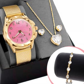 Pulseira + relogio feminino aço prova dagua Adquira já o Kit Elegante de Acessórios Relógio e adicione um toque de glamour e sofisticação ao seu visual O conjunto inclui um Relógio Analógico à Prova D'água, com uma deslumbrante cor dourada e fundo rosa, pulseira em silicone ajustável para garantir conforto. Além disso, vem com um Colar Banhado com Pingente de Strass em forma de coração, um par de Brincos Banhados com design de coração, e uma Pulseira Banhada com pedrinhas para completar seu visual com um brilho sutil. Este kit inclui também uma caixa premium Orizom Maria para uma apresentação requintada. Garanta já o seu Ean: 7894639229979