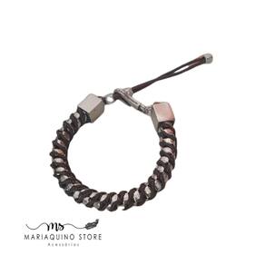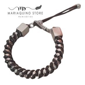 Encante-se com essa pulseira linda, toda trabalhada em corrente veneziana na cor prateada trançada em fio de macramê na cor café. Dando a peça um estilo único fazendo com que as misturas do metal sobressaiam no tom marrom.