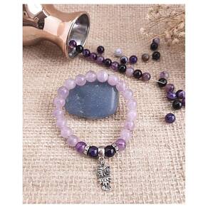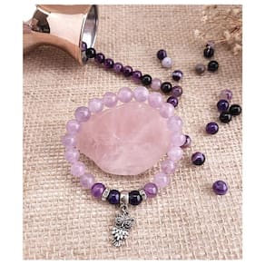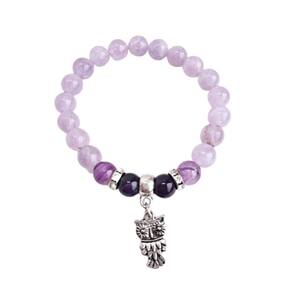 Pulseira Silicone elástico Pedra Jade Lilás Pingente Coruja Pulseira em Pedras Naturais Jade lilás 8mm com Pingente Coruja