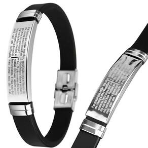 Pulseira silicone pai nosso placa aço inox prata masculina estiloso religioso ajsutavel preta casual Pulseira prata masculina com oração pai nosso ajustável - elegância com significado