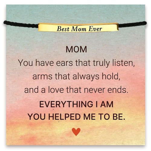 - Mensagem do cartão: "Mamãe tem ouvidos que realmente escutam; braços que sempre seguram; um amor que nunca acaba. Everything I am you helped me to be." Esta pulseira de prata esterlina 925 é perfeita para qualquer mãe, mãe bônus ou madrasta, simbolizando sua profunda apreciação e amor.