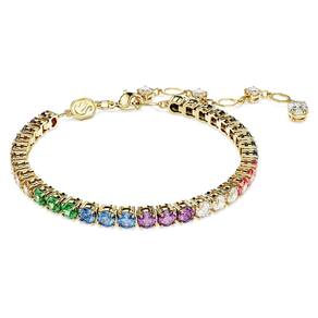 - Fixada com um fecho de lagosta, a joia banhada a ouro apresenta uma fileira vibrante de pedras coloridas de arco-íris, cada uma colocada em uma configuração refinada de pinos