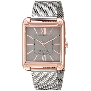 Relógio feminino de malha Sunray Dial Nine West — lente de cristal mineral; mostrador cinza com ponteiros e marcadores em ouro rosa; faixa de minutos interna impressa em preto — Pulseira de malha de aço inoxidável prateada com elos ajustáveis; o relógio vem com um link extensor adicional incluído na pulseira que pode ser removido para ajustar facilmente o ajuste do relógio, sem a necessidade de ferramentas — Movimento de quartzo japonês — Diâmetro da caixa: 29 milímetros — Interior circunferência da faixa: 7 polegadas - resistente a respingos