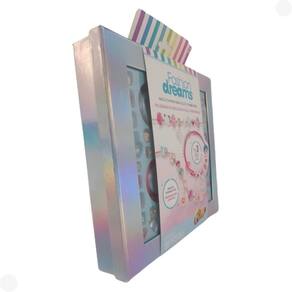 Conteúdo da Embalagem: 01 pulseira metalica, 02 pulseiras de cordão, 15 contas decorativas, 03 berloques, 06 berloques de contas e 1 folha de instrução.