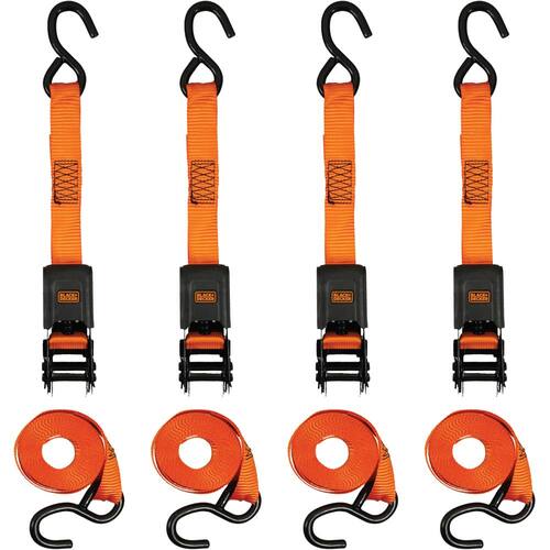 BLACK+DECKER BDX1006 Preto/Laranja 2,54 cm x 30,5 cm Catraca Tiras de Amarração com Alças Acolchoadas (Resistência à ruptura de 0,7 kg) para prender a carga, pacote com 4 - Alças duráveis de 2,5 cm de largura x 2,5 m de comprimento com 226,8 kg. Força de trabalho e 700 g. resistência à ruptura - Ganchos em S revestidos de vinil protegem sua carga e veículo - Confortável, design de cabeça de catraca acolchoada preta - Almofada de liberação texturizada para facilidade de uso - Costura reforçada e tiras resistentes ao clima