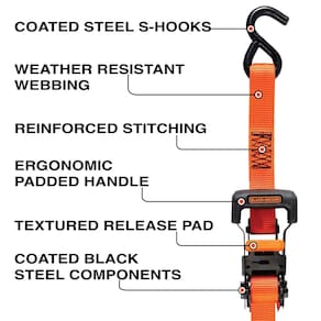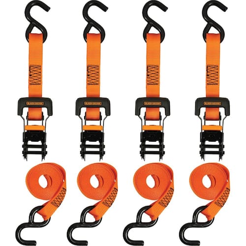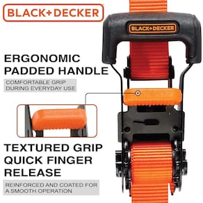 BLACK+DECKER BDX1007 Tiras de amarração catraca preta/laranja, 2,5 cm x 2,5 m com alças ergonômicas (força de ruptura de 1,1 kg) para prender a carga, pacote com 4 - Alças duráveis de 2,54 cm de largura x 3,5 m de comprimento com 377 kg. Força de trabalho e 1,1 kg. resistência à ruptura - Ganchos em S revestidos de vinil protegem sua carga e veículo - Confortável, design de cabeça de catraca com alça grande - Almofada de liberação texturizada para facilidade de uso - Costura reforçada e tiras resistentes ao clima