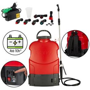 Modelo: BPC 20 BL Tipo de pulverizador: Costal Acionamento: Bateria Autonomia da bateria: 6 a 10 horas* Tempo de recarga: 8 horas Bateria removível: Sim Volume máximo do reservatório: 20L Volume recomendado do reservatório: 19,5L Material do reservatório: Polietileno Regulador de pressão/vazão: Sim - potênciometro Monitoramento consumo bateria: Sim Pressão de trabalho: 4,5 bar Vazão Máxima: 2,8 L/min** Diâmetro do bocal superior: 127,0 mm Comprimento da lança: 55 Mín - 100 Máx (cm) Tamanho ajustável Comprimento da mangueira: 120 cm Gatilho: Metálico com trava