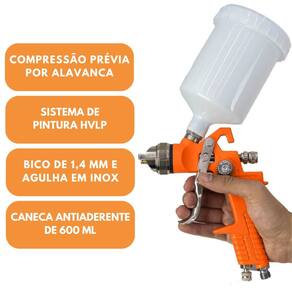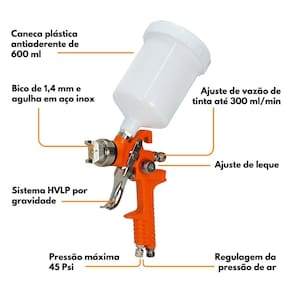 Marca: Intech Machine Modelo: P827 Material do Corpo: Alumínio Material da Agulha: Aço Inox Tipo: Gravidade Bico padrão: 1,4 mm Largura (frente) padrão: 16-26 cm Vazão de tinta: 200-300 ml/min Capacidade: 600 ml Pressão máxima 45 psi Pressão de trabalho 30 a 40 psi Consumo de ar: 4 PCM Entrada de ar: 1/4" Diâmetro do bico: 1,4 mm Peso do produto: 0,65 kg
