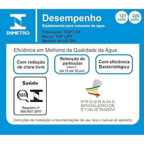 Além dessas funcionalidades, o Purificador De Água Top Life BlueOxi 2 Em 1 Branco 127V possui diversas especificações técnicas que garantem a sua eficiência. Sua vazão máxima é de 45 l/h, e seu refil tem uma vida útil de 3.000 litros. Com um volume interno de 0,24 litros, ele possui uma pressão de trabalho entre 3 a 40 m.C.A /29kPa a 390 kPa e uma eficiência de retenção de partículas classe D 15 a 30 um . Seu pH varia entre 8,5 e 9,3, e o ozônio gerado tem uma média de 0,25 mg/L, com uma potência de 5W.