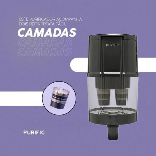O Purificador de Água Purific 20 para Bebedouro é o primeiro do mundo a substituir o antigo galão. Compatível com uma ampla variedade de bases refrigeradas, proporciona praticidade e economia. Ele acompanha dois refis Camadas Troca Fácil com sete camadas de proteção, realizando purificação completa da água. Cada refil tem capacidade de purificar até 1200 litros. Placa de imãs e infravermelho longo; Regula o pH da água; Reduz cloro; Reduz vírus e bactérias mínimo 99,99% ; Retém partículas; Reduz algas; Reduz fármacos; Reduz metais pesados; Reduz ; Reduz trihalometanos. Metodologia: Standard Methods for the Examination of Water and Wastewater, 2005 Legislação: Portaria Nº 888 de maio de 2022 - Ministério da Saúde Laudos: Emitidos pela UEM Universidade Estadual de Maringá Ficha Técnica: Capacidade: 19 litros total Refil: 2 Camadas Troca Fácil Purificação: 1200 litros 600 por refil Abastecimento: Manual ou rede hidráulica kit não incluso Dimensões sem base: 53 x 27 x 27 cm Dimensões com base: 45 x 27 x 27 cm Embalagem: 60 x 30 x 31 cm Peso: 4,2 kg Livre de BPA e PP-BIP-F Marca: Não Informado Ean: 7898965670405