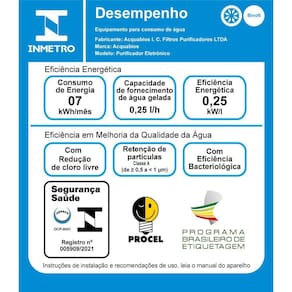 Purificador de água gelada premium eletronico acquabios branco Purificador de água acquabios premium refrigerado branco bivolt Pensando em trazer mais qualidade de vida para você e sua família a acquabios desenvolveu a linha de purificadores de água premium. Estes purificadores contam com design moderno e minimalista, capaz de acrescentar a seus ambientes de maneira discreta e elegante. Podem ser instalados tanto em bancadas ou em paredes para uma maior comodidade. Possuem saída de água com iluminação, facilitando a visualização para os usuários além de contar com led indicador para troca de refil. Especificações técnicas: - marca: acquabios - linha: premium - modelo: 1008-0069 - voltagem: bivolt - tipo: purificador de água de bancada ou parede - cor: branco - capacidade de refrigeração: 0,25l/h - volume inteiro do reservatório: 0,8l - eficiência energética: 0,25kw/l - consumo energético: 7kwh/mês - vazão nominal: 20l/h - pressão: 50 a 400 kpa - redução do cloro livre: aplicável - possui eficiência bacteriológica: sim - classe de retenção de partículas: classe a - vida útil do refil: 1.500 l - refil: girou trocou - refil: alcalino - saída de água com iluminação: sim - retenção de partículas: classe a - temperatura de operação: 5 graus célsius a 32 graus célsius - tecnologia de refrigeração: eletrônica - acompanha: kit de instalação com registro 1/2 e mangueira - led indicativo para troca de refil: sim - dimensões do produto lxaxp : 26 x 38 x 30 cm - dimensões da embalagem lxaxp : 28,3 x 40,3 x 32,5 cm - peso líquido: 5kg - peso bruto: 5,70kg