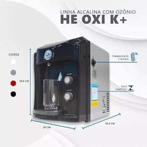 Purificador de água super alcalina ionizada com ozônio e potássio. Voltagem: 127V. Dimensões aproximadas: 29cm (Largura) x 38,6cm (Altura) x 39,4cm (Profundidade). Peso líquido aproximado: 11kg a 12kg.Função retrolavagem