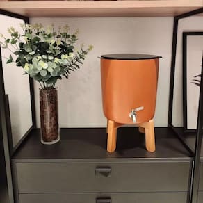 Purificador de água alcalina Acqualive Fresh Terracota 6L com design retrô, ideal para uso doméstico. Produz água alcalina rica em magnésio, livre de cloro e impurezas. Possui refil com cerâmica porosa, nanopartículas de prata, carvão ativado e mix de minerais essenciais.Função retrolavagem