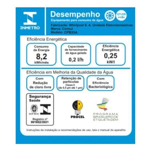 O Purificador de Água Cônsul Classe A - CPB33 - Painel Touch é a solução perfeita para quem busca funcionalidade, tecnologia e design em um único produto. Com a máxima redução de cloro livre, eficiência bacteriológica e retenção de partículas de nível Classe A, esse purificador garante uma água de qualidade excepcional para sua casa.