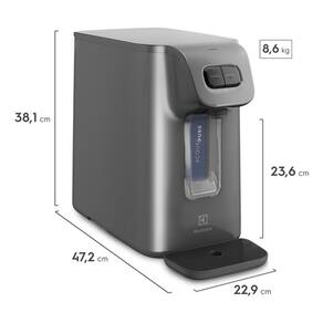 Descubra a revolucao na qualidade da agua que voce consome com o Purificador de Agua Electrolux PC01X. Com um design moderno na cor grafite, este purificador se destaca nao apenas pela estetica, mas tambem pela funcionalidade. Ele possui dimensoes de 22,9x47,2x38,1 cm e pesa 8,65 Kg, sendo compacto e facil de instalar em qualquer ambiente. O produto acompanha embalagem tipo caixa, que inclui o purificador e manual de instrucoes, garantindo uma instalacao segura e sem complicacoes.