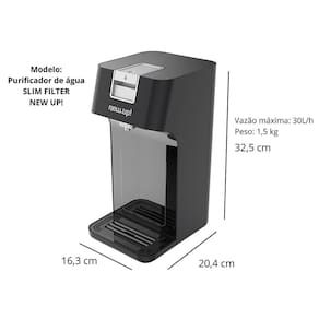 Características Principais do Produto: Altura: 32,5 cm Largura: 16,3 cm Comprimento: 20,4 cm Cor: Preto Temperatura da Água: Natural Tipo Bebedouro/Purificador: Purificador