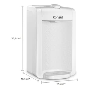 Apresentamos o Purificador de Agua Residencial Compacto da Consul, modelo CPC31AB. Este aparelho e de altissima qualidade, fabricado em plastico ABS resistente na cor branca, com dimensoes de 30,50 cm de altura, 18,40 cm de largura e 17,60 cm de profundidade, pesando apenas 1,60 Kg. O design compacto e a tonalidade neutra permitem que se harmonize facilmente com qualquer ambiente da sua casa.