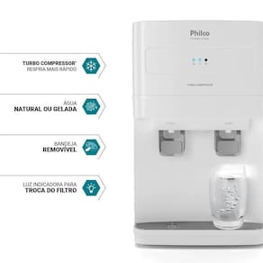 Sistema de refrigeração por compressor turbo com gás R600a. Filtro Classe A com carvão ativado e membrana UF. Luzes indicadoras de funcionamento e troca de filtro. Bandeja coletora removível. Sistema Easy Clean. Tomada 10A com 3 pinos.Função retrolavagem