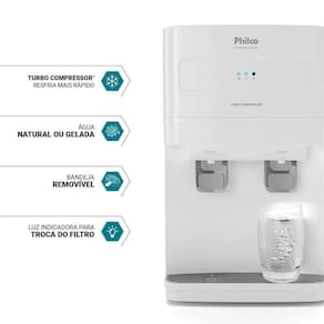 Sistema ECO com gás R600a, refrigeração por compressor turbo, filtro de carvão ativado, duas torneiras (natural e gelada), bandeja coletora removível, luz indicadora de troca de filtro, funcionamento silencioso.Função retrolavagem