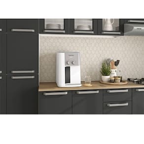 O purificador tem capacidade para 2,3L de agua gelada, 7 niveis de temperatura e mesmo sem energia voce ainda tem agua purificada e natural.