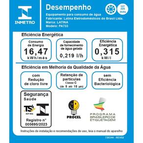 O PA733 da Latina é um purificador de água refrigerado, certificado pelo Inmetro, com excelente eficiência comprovada em eliminação de impurezas e remoção de cloro.