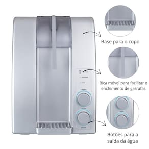 Purificador de água refrigerado com sistema de refrigeração eletrônica, bica móvel, bandeja removível e filtro bacteriostático.Função retrolavagem