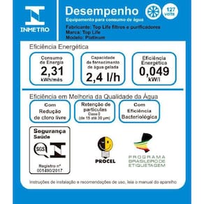 O Purificador de Água Newoxi é responsável pela purificação da água com ozônio, conhecido por sua elevada propriedade bactericida. Acionando o botão ozonizador, o Filtro Top Life libera a substância na água, tornando-a ideal para higienizar alimentos e objetos que necessitam de esterilização, reduzindo drasticamente uma série de elementos causadores de doenças, como impurezas, bactérias, vírus e fungos.Especificações TécnicasMarca: Top LifeLinha: NewOxi com Super OzônioCor: PretoTensão: 127VPotência: 100 WVolume Interno do Aparelho: 2,0 LVida útil refil: 3.000 LITROS Capacidade de refrigeração com ambiente a 32ºC e a água a 27ºC: 2,4 l/hGás refrigerante: R 134 A Vazão Máxima: 60 l/h Grau de Proteção: IPX0Amperagem: 0,78 A Frequência - Mercado Nacional: 60 Hz Consumo de Energia: 2,31 kWh/mêsEficiência Energética: 0,049 kW/LPressão de Trabalho: 3 A 40 m.C.A /29kPa a 390 kPaGarantia: 6 mesesDimensões (AxLxP): 39cm x 30,5cm x 41cmPeso: 12 kgProduto destinado a água pré-tratada de acordo com a portaria 2914 MS.Sobre a Top LifeCom mais de 26 anos no mercado, a Top Life é uma das maiores distribuidoras/fabricante de Purificadores de Água do Brasil. Está presente em todo território nacional, levando saúde a grandes industrias, comércios e residências, através de uma água pura de verdade. Ean: 7909463106539