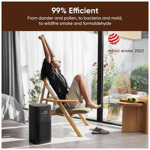 Purificador de ar com filtro HEPA 13, capaz de limpar salas grandes com capacidade de purificação de 350 mh CADR. Possui três opções de filtro (padrão, especial e premium) que visam partículas, pólen, odor, fumaça, cinzas, cheiro de fumaça e formaldeído. Sensor de poeira a laser verifica a qualidade do ar, medindo partículas de até 0,3 mícrons e ajustando automaticamente. Nível de ruído de 21,0 DB no modo de sono e 54,0 DB no modo alto. Controles inteligentes com rastreamento AQ interno e externo detalhado e controle remoto.Função retrolavagem