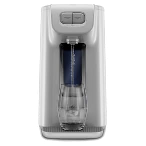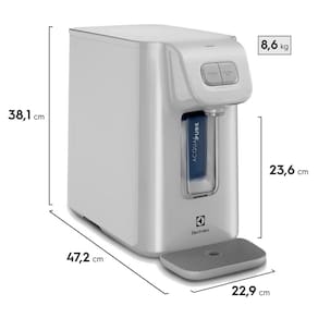 Purificador de água com compressor, oferece água gelada, fria e natural. Possui reservatório de 1,7L e durabilidade do refil de 6 meses ou 3000L.Água gelada