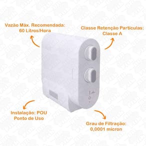 Este aparelho purifica a água através da tecnologia de osmose reversa, garantindo uma água extremamente pura. Retém partículas maiores que 0,0001 mícron, garantindo assim uma água livre de sais, dureza, vírus, bactérias, entre outras substâncias nocivas à saúde humana. A retenção de sais é de 94%, o que permite o seu uso para aplicação residencial Dimensões aproximadas : 367mm comprimento x 152mm largura x 367mm altura Classe de retenção de partículas: classe a Eficiência na redução de cloro livre: aplicável redução = 75% Vazão nominal: 60 litros / hora Pressão de operação: máxima 392 kpa 4,0 bar - mínima 100 kpa 1,0 bar Temperatura de operação: 5 a 38 c Voltagem: 100 - 240v Potência: 65w Limite de tds da água de entrada: 1.000 ppm Modelo dos elementos filtrantes: cbpa/por400g e ro/por400g