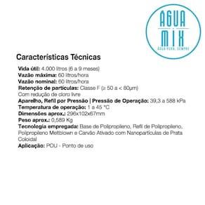 PURIFICADORPURE9 CABELOS Código: 2018Produto evita a agressão do cloro no couro cabeludo, aumenta a durabilidade da coloração e dos tratamentos aplicados nos cabelos. Para os fios virgens, o brilho e sedosidade poderão ser sentidos ainda mais, proporcionando uma hidratação de ponta a ponta. Tudo isso em 3 etapas de filtragem.Características TécnicasVida útil: 4.000 litros (6 a 9 meses)Vazão máxima: 60 litros/horaVazão nominal: 60 litros/horaRetenção de partículas: Classe F (= 50 a < 80µm)Com redução de cloro livreAparelho, Refil por Pressão | Pressão de Operação: 39,3 a 588 kPaTemperatura de operação: 1 a 45 °CDimensões aprox.: 296x102x67mmPeso aprox.: 0,589 KgTecnologia empregada: Base de Polipropileno, Refil de Polipropileno, Polipropileno Meltblown e Carvão Ativado com Nanopartículas de Prata ColoidalAplicação: POU - Ponto de uso