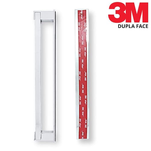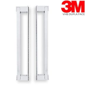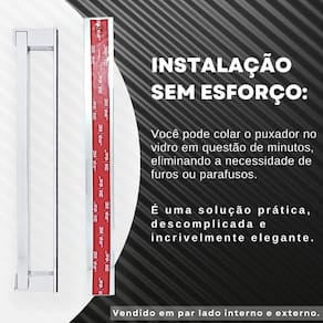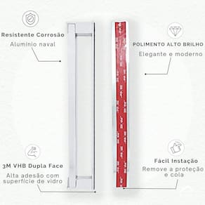 - modelo: puxador duplo de porta de vidro modelo 'u' polido alto brilho de colar. - material: barra retangular 1x 1/2 em alumínio com base maciça. - comprimento total: 30 cm. - base que cola no vidro: 30 cm. - espessura do adesivo: 19 mm utiliza adesivo dupla face 3m vhb - indicado para: portas de abrir de giro, pivotantes e de correr.