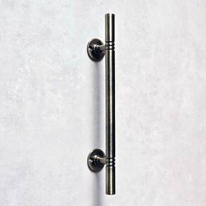 Comprimento: 248 mm Diâmetro da base: 32 mm Profundidade: 38 mm Diâmetro da haste: 13mm Distância entre furos: 158 mm Peso: 0,63 kg Material: zinco Acompanha: parafusos para instalação Quantidade: kit com o par de puxadores para os 2 lados da porta puxador duplo