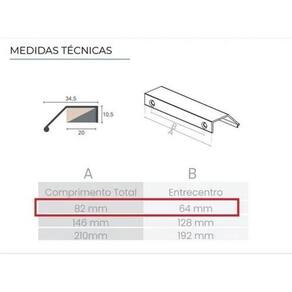 Puxador em alumínio para móveis firenzedescrição técnica:- material: alumínio- modelo: firenze 7015- puxador angulo 45º- medidas disponiveis: 82mm furo a furo 64mm , 146mm furo a furo 128mm , 210mm furo a furo 192mm disponível em outros anuncios - espessura: 1,3mm- parafuso para instalação: 4,0 x 16mm não inclusos características: puxador ideal para qualquer tipo de móvel. Funciona em portas de bater ou de correr ou frentes de gavetas com limitide máximo de espessura em 18mm da porta/gaveta.Diferencial:puxador primeiramente é cortado depois tem suas pontas abauladas, escareado na parte traseira e posteriormente lixado, após todo esse processo recebe a anodização/pintura, por isso ele é 100% na cor, até mesmo as laterais. Opções: Cores disponíveis em outros anúncios: preto, anodizado cinza , inox escovado bronze claro , rose gold cobre , branco e dourado Medidas disponiveis em outros anuncios : 82mm furo a furo 64mm , 146mm furo a furo 128mm , 210mm furo a furo 192mm Marca: Alternativa Componentes