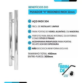 Material: aço inoxidável Acabamento: polido Diâmetro: 32 mm Formato: redondo Tamanho: 45 cm Distância entre furos: 30 cm Fixação: parafusos inclusos Aplicação: portas pivotantes de alumínio ou vidro ou madeira Durabilidade: alta