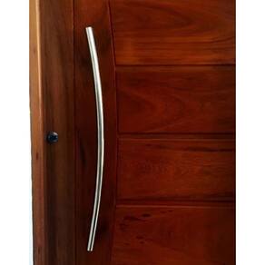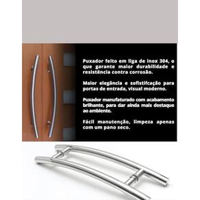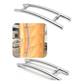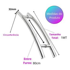 Material: aço inoxidável Acabamento: escovado Formato: curvo / tubular bellíssima Tamanho: 100 cm ou 1 metro Distância entre furos: 80 cm Fixação: parafusos inclusos Aplicação: portas pivotantes de alumínio ou vidro ou madeira Durabilidade: alta