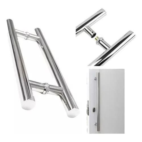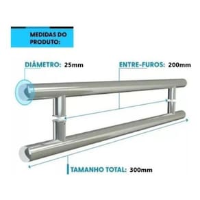 Material: aço inoxidável Acabamento: polido Diâmetro: 25 mm Formato: redondo Tamanho: 30 cm Distância entre furos: 20 cm Fixação: parafusos inclusos Aplicação: portas pivotantes de alumínio ou vidro ou madeira Durabilidade: alta