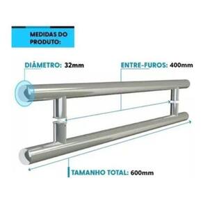 Material: aço inoxidável Acabamento: polido Diâmetro: 32 mm Formato: redondo Tamanho: 60 cm Distância entre furos: 40 cm Fixação: parafusos inclusos Aplicação: portas pivotantes de alumínio ou vidro ou madeira Durabilidade: alta