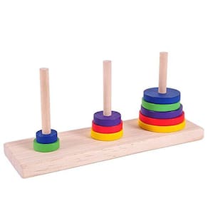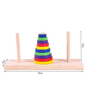 Esta torre de Hanói consiste em três hastes e sete discos redondos de tamanhos diferentes e uma placa. O objetivo do quebra-cabeça é mover a pilha inteira para outra haste, você pode mover uma peça por vez e só pode colocar uma peça menor em cima de uma peça maior. A versão de 10 anéis requer 1023 movimentos.