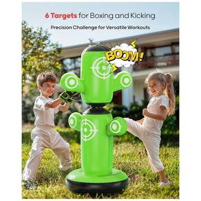 Saco de pancadas inflável infantil QPAU com estrutura rotativa 360°, indicado para boxe, karatê, kickboxing, artes marciais mistas e taekwondo recreativos para crianças de aproximadamente 6 a 14 anos. O design segmentado em partes superior e inferior permite que o pilar gire durante o uso, aumentando a interatividade e possibilitando treinos de esquiva e deslocamento.?