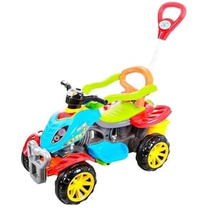 Com o aro protetor, apoio de pés e empurrador, esse Quadriciclo Passeio e Pedal um carro seguro e divertido. O mini veículo também tem rodas com borracha para não derrapar, buzina e bagageiro!