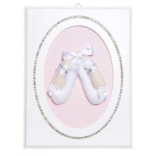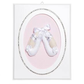 Quadrinho em madeira com fino acabamento laqueado e perfeito para colocar na porta da maternidade ou no quarto do bebê. Eternize esse momento especial com esse enfeite decorativo, que proporcionará uma ambientação convidativa e encantadora. Dados Técnicos Quadrinho feito em madeira MDF com pintura laqueada, strass em volta e tecido de fundo. A decoração é feita com um par de sapatilhas de bailarina em feltro. O preço referese a 1 unidade. Medidas Comprimento: 30 cm Largura: 23 cm Espessura: 2 cm