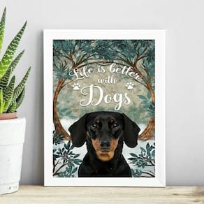 Quadro a vida é melhor com cães 24x18cm - com vidro Moldura: madeira branca Informações do produto tire todas as suas dúvidas no descritivo abaixo: decoração para quarto, sala, cozinha, escritório, área gourmet e muito mais. Chega de paredes vazias medidas - cada peça tem 24x18cm a5 . Material do papel - papel fotográfico brilhante de altíssima resolução acabamento - todos os quadros são acompanhados de vidro para proteção da imagem. - moldura em madeira maciça na cor preta ou branca conforme produto escolhido e pendurador . - os quadros são embalados de forma segura com plástico bolha com camada dupla de acordo com o tamanho dos quadros. Garantia - garantia de 3 meses. Meu quadro chegou. Como posso fixá-lo Você precisa apenas de um martelo e um prego, pois os quadros já vão acompanhados de penduradores. Esta é a forma mais indicada. Como posso limpar meu quadro A limpeza é feita como um móvel comum da sua casa. Apenas um pano seco ou espanador são suficientes para tal