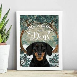 Quadro a vida é melhor com cães 45x34cm - com vidro Moldura: madeira preta Informações do produto tire todas as suas dúvidas no descritivo abaixo: decoração para quarto, sala, cozinha, escritório, área gourmet e muito mais. Chega de paredes vazias medidas - cada peça tem 45x34cm a3 . Material do papel - papel fotográfico brilhante de altíssima resolução acabamento - todos os quadros são acompanhados de vidro para proteção da imagem. - moldura em madeira maciça na cor preta ou branca conforme produto escolhido e pendurador . - os quadros são embalados de forma segura com plástico bolha com camada dupla de acordo com o tamanho dos quadros. Garantia - garantia de 3 meses. Meu quadro chegou. Como posso fixá-lo Você precisa apenas de um martelo e um prego, pois os quadros já vão acompanhados de penduradores. Esta é a forma mais indicada. Como posso limpar meu quadro A limpeza é feita como um móvel comum da sua casa. Apenas um pano seco ou espanador são suficientes para tal