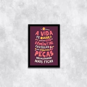 Quadro a vida te quebra pra você remontar 24x18cm - com vidro Moldura: madeira branca Informações do produto tire todas as suas dúvidas no descritivo abaixo: decoração para quarto, sala, cozinha, escritório, área gourmet e muito mais. Chega de paredes vazias medidas - cada peça tem 24x18cm a5 . Material do papel - papel fotográfico brilhante de altíssima resolução acabamento - todos os quadros são acompanhados de vidro para proteção da imagem. - moldura em madeira maciça na cor preta e pendurador . - os quadros são embalados de forma segura com plástico bolha com camada dupla de acordo com o tamanho dos quadros. - de 3 meses. Meu quadro chegou. Como posso fixá-lo Você precisa apenas de um martelo e um prego, pois os quadros já vão acompanhados de penduradores. Esta é a forma mais indicada. Como posso limpar meu quadro A limpeza é feita como um móvel comum da sua casa. Apenas um pano seco ou espanador são suficientes para tal Ean: 7895145442784
