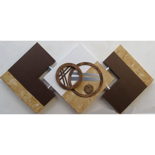 Quadros formados por 3 painéis em forma de losângos, interligados por estrutura de alumínio. Painel moderno decorativo, pintura acrílica, com textura e apliques em alumínio e mdf. Ideal para vários ambientes. Cores: Quadro - Tabaco e tons pastéis. tamanho: 57x120cm