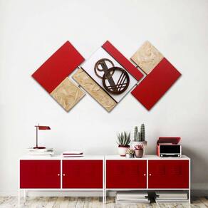 Dimensões: 120x57cm - 4 cm de espessura. Quadro formado por 3 painéis em forma de losango, interligados por estrutura de alumínio. Painel moderno decorativo, pintura acrílica, com textura e apliques em mdf. Cor: vermelho vivo e tons pastéis.