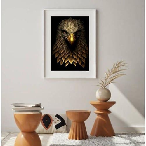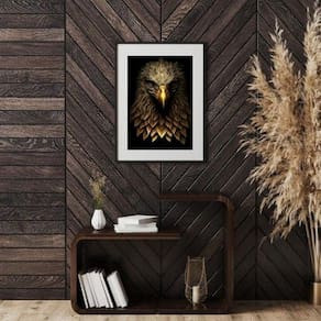 Quadro águia dourada - 60x48cm Moldura: madeira branca Informações do produto tire todas as suas dúvidas no descritivo abaixo: decoração para quarto, sala, cozinha, escritório, área gourmet e muito mais. Chega de paredes vazias medidas - cada peça tem 60x48cm . Material do papel - papel fotográfico brilhante de altíssima resolução acabamento - todos os quadros são acompanhados de vidro para proteção da imagem. - moldura em madeira maciça na cor preta ou branca conforme produto escolhido e pendurador. - paspatur branco com 7cm de largura - os quadros são embalados de forma segura com plástico bolha com camada dupla de acordo com o tamanho dos quadros. Garantia - garantia de 3 meses. Meu quadro chegou. Como posso fixá-lo Você precisa apenas de um martelo e um prego, pois os quadros já vão acompanhados de penduradores. Esta é a forma mais indicada. Como posso limpar meu quadro A limpeza é feita como um móvel comum da sua casa. Apenas um pano seco ou espanador são suficientes para tal