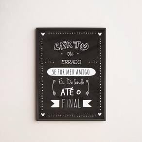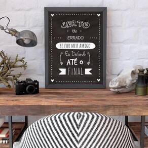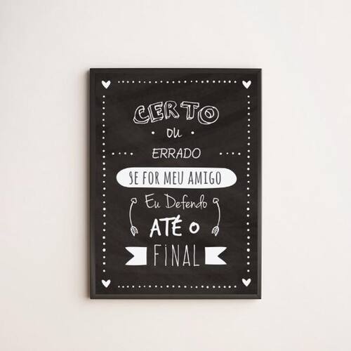 Quadro amigo até o final 33x24cm - com vidro Moldura: madeira preta Informações do produto tire todas as suas dúvidas no descritivo abaixo: decoração para quarto, sala, cozinha, escritório, área gourmet e muito mais. Chega de paredes vazias medidas - cada peça tem 33x24cm a4 . Material do papel - papel fotográfico brilhante de altíssima resolução acabamento - todos os quadros são acompanhados de vidro para proteção da imagem. - moldura em madeira maciça na cor preta e pendurador . - os quadros são embalados de forma segura com plástico bolha com camada dupla de acordo com o tamanho dos quadros. - de 3 meses. Meu quadro chegou. Como posso fixá-lo Você precisa apenas de um martelo e um prego, pois os quadros já vão acompanhados de penduradores. Esta é a forma mais indicada. Como posso limpar meu quadro A limpeza é feita como um móvel comum da sua casa. Apenas um pano seco ou espanador são suficientes para tal